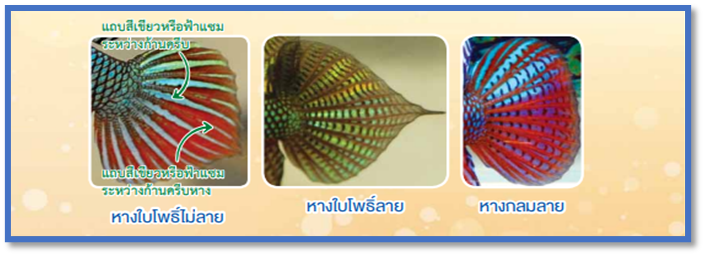 ลักษณะครีบ ครีบหางและครีบก้นมักจะมีลวดลายเป็นขีดๆ หรือเป็นรอยแตก (Interray membranes) ที่ชัดเจนกว่าภาคอื่นๆ